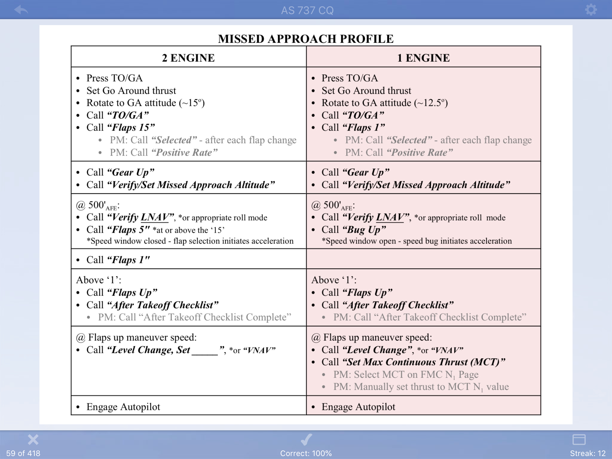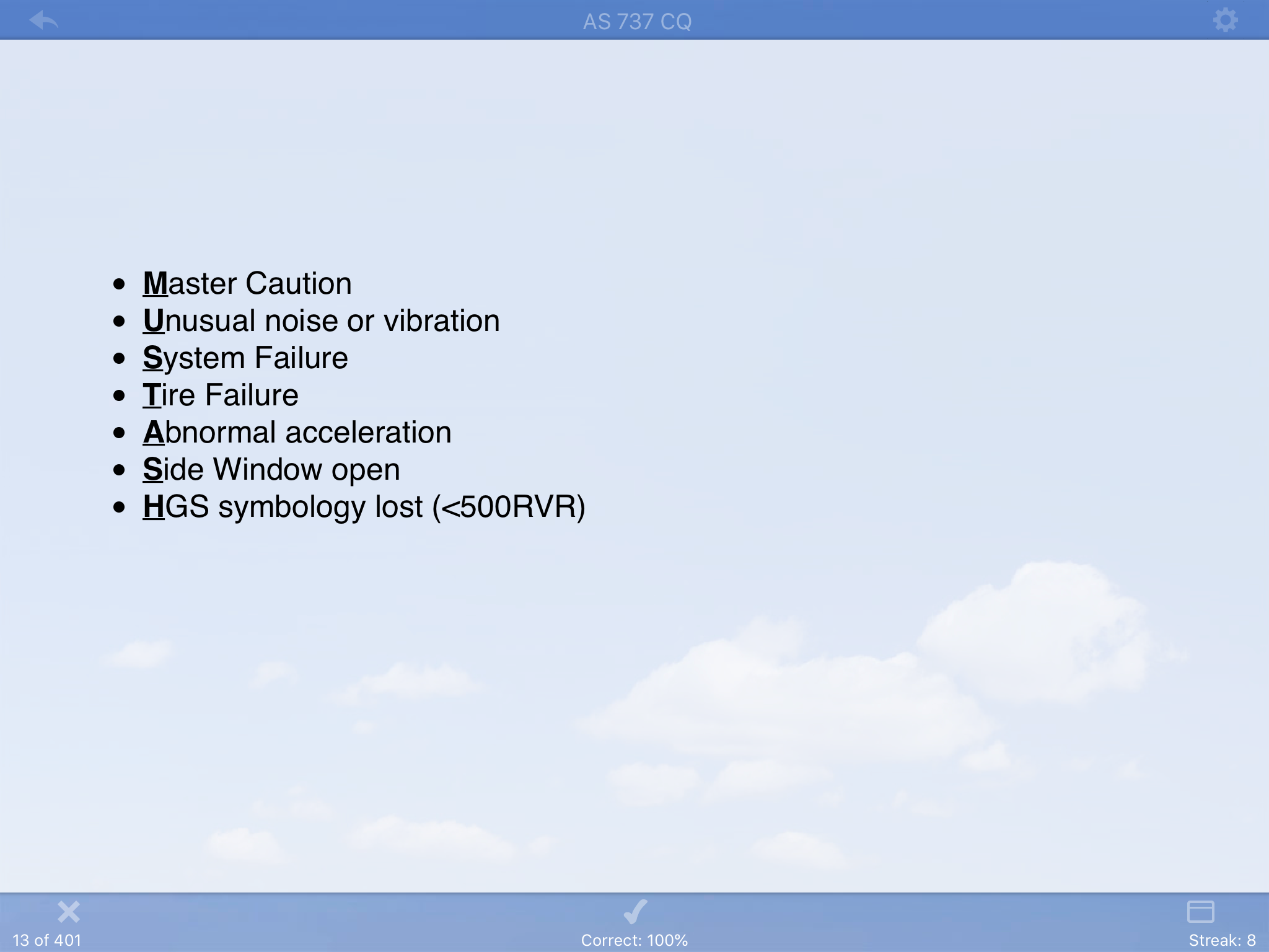 These are personal flashcards and are in no way associated with or endorsed by Alaska Air. It is critical that one reads the appropriate manuals when studying, as this cardset is intended soley as a study supplement. While every effort has been made to ensure the information contained in this cardset was accurate upon publication, no warranty or guarantee of any kind, expressed or implied, is given regarding the accuracy, reliability, or completeness of the information provided here. In the event of a discrepancy, always defer to company manuals. Under no circumstances will the author be held liable for the outcome of any training event, checking event, or flight operation, caused by using the information contained in this cardset. Your use of this cardset implies your consent to these limitations.